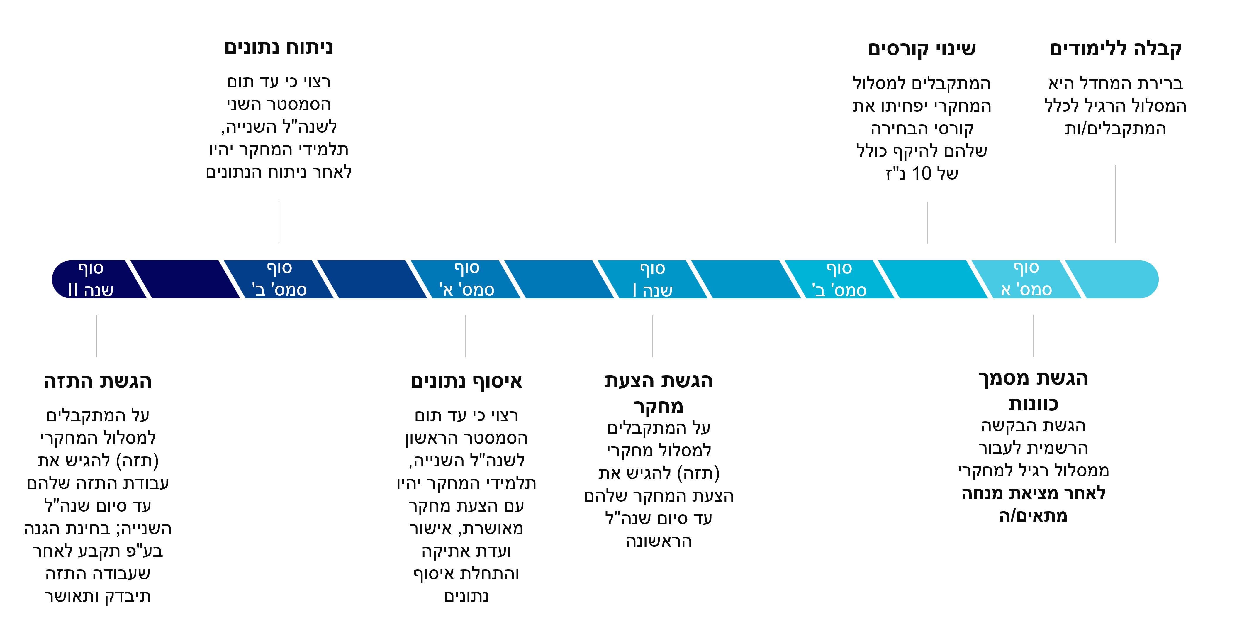 תלמידים במסלול המחקרי (עבודת תזה), יפעלו לפי לוח הזמנים הבא (כמפורט באיור):